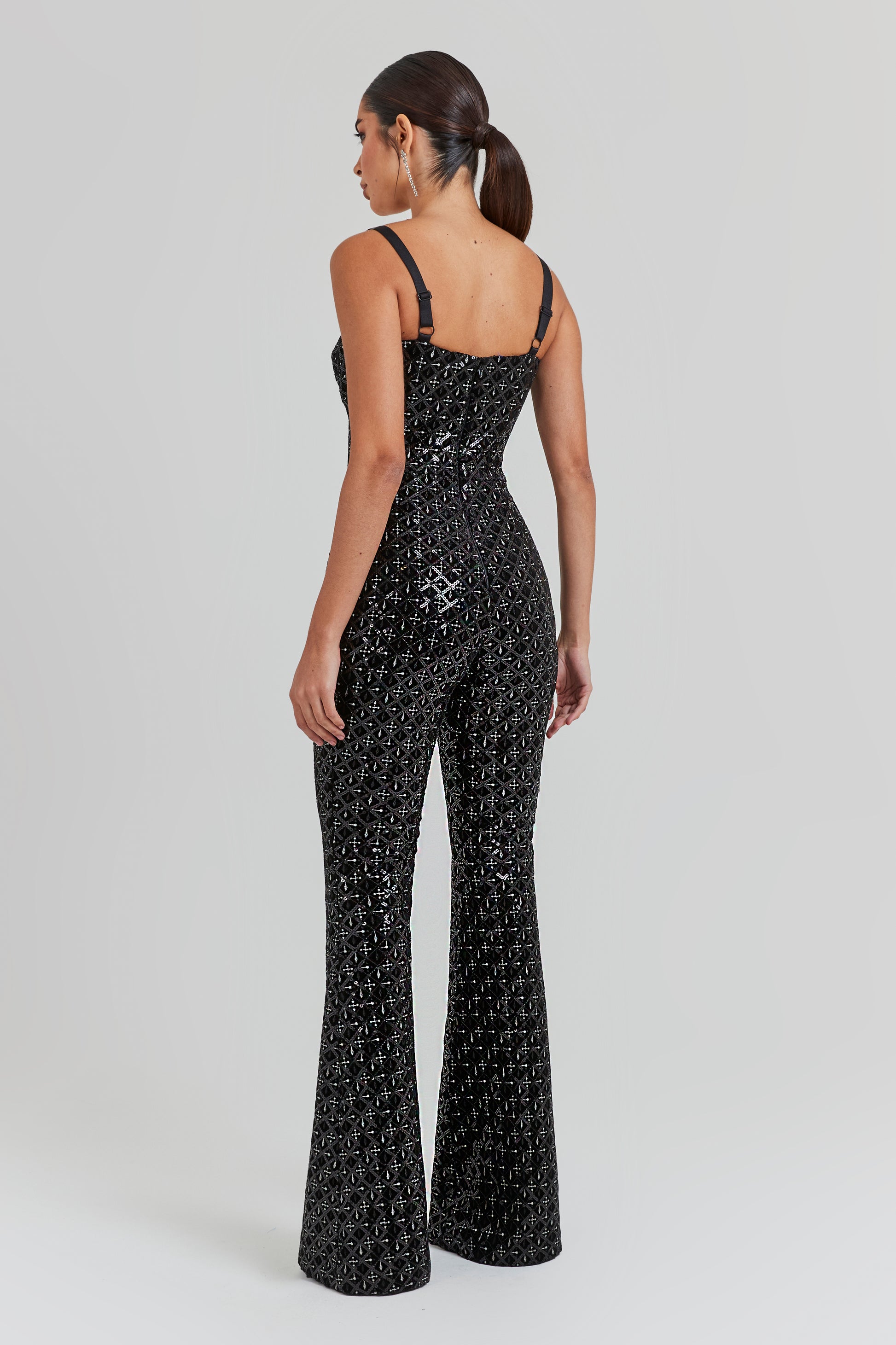 HAILEY Black Sequin Jumpsuit combines timeless allure with bold elegance. Crafted from our exclusive shimmering velvet fabric, this black sequin flare jumpsuit is embellished with hand-embroidered sequins and metallic thread for a captivating, light-catching finish. The figure-hugging design is complemented by a corset-style bodice with structured boning, creating a flawless, sculpted silhouette. The flared trouser adds a touch of retro drama to this black jumpsuit for an effortlessly chic, timeless look. Complete with a concealed zip closure.