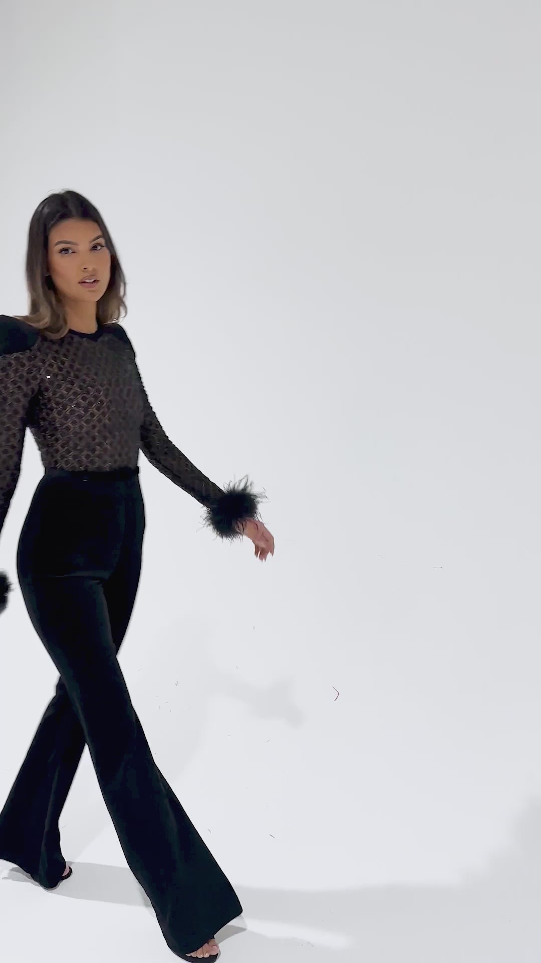 Meet Monique, our long-sleeve black velvet jumpsuit, and your next forever piece. This blend of delicate lace and plush velvet is designed to make you feel as alluring as you look. The jumpsuit has a nude lining, which provides coverage while accentuating the intricate lace detailing. The feather trim at the cuffs and contrast black belt add dramatic flair to this chic piece. This style looks equally as good paired with or without the belt.