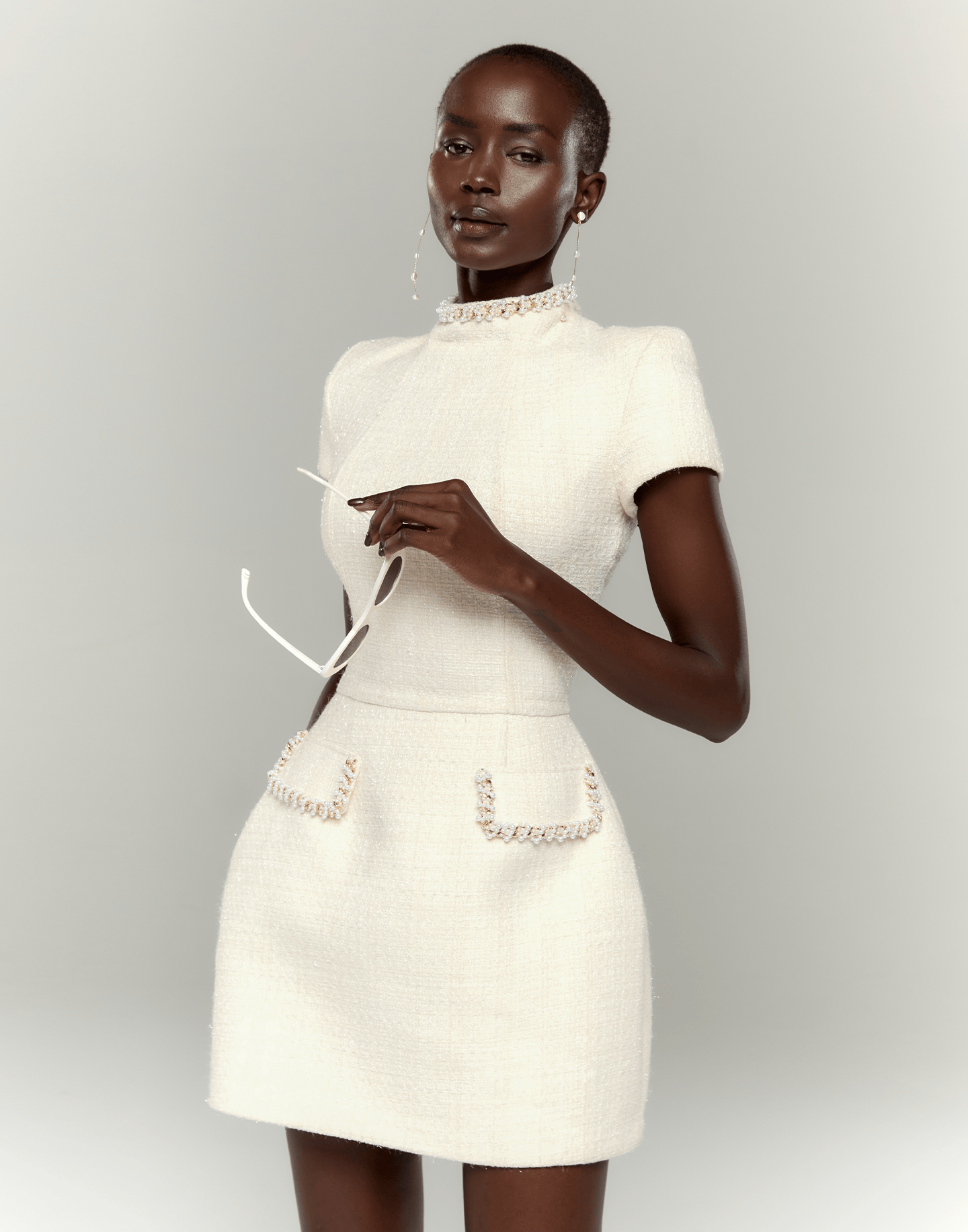 Make your birthday one to remember in the TATE Silver Dress. Crafted from decadent, fully beaded fabric with jewel detailing, this mini dress is perfect for dancing, toasting, and celebrating every moment.