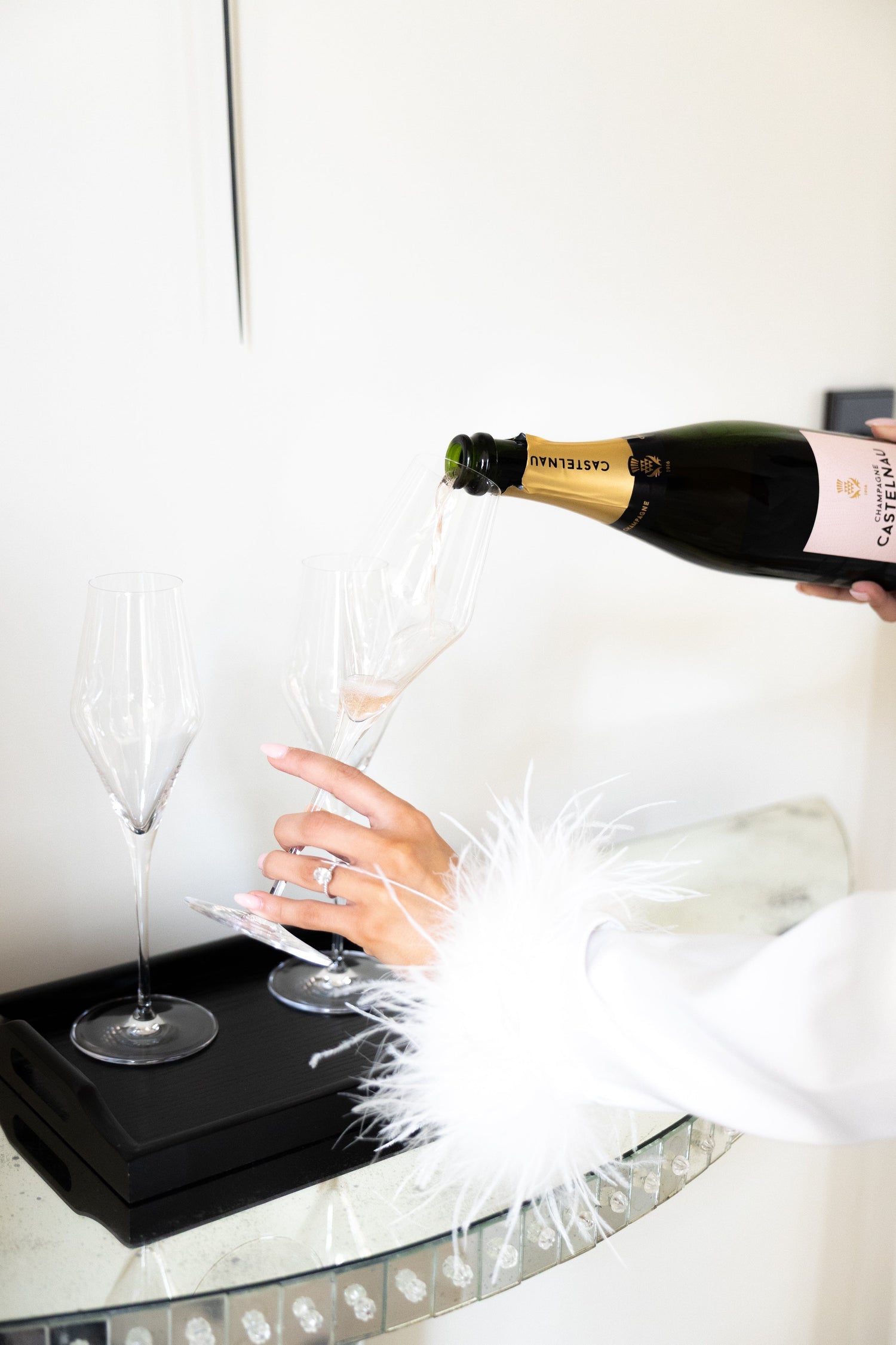 After a morning flight from London to Bordeaux, the experience began as soon as our guests arrived at the Château. The girls settled in and changed into their first MERABI look, the DARCIE White Pyjamas, styled with heels of their choice. Their rooms were prepared ahead of their arrival complete with their outfits for the trip, embroidered beauty bags filled with bridal essentials from Space NK, welcome notes, and personalised touches. Once ready, they were greeted with a glass of champagne and a family-style lunch in the dining room.