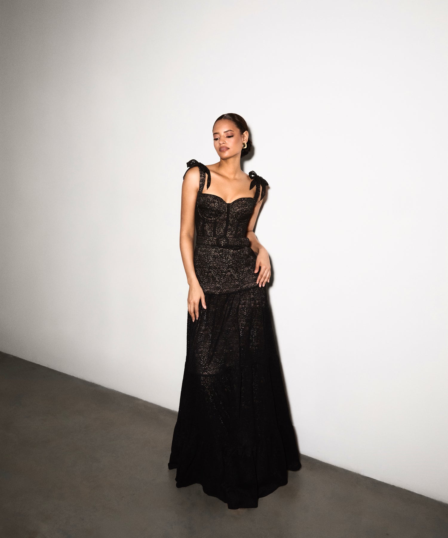 The Naomi Black Dress is a classic choice. Designed in black floral lace and detailed with sequin embellishments, it features a high neckline, structured shoulder pads, and long sleeves. A black satin belt cinches the waist, creating a striking silhouette that blends grace with confidence.