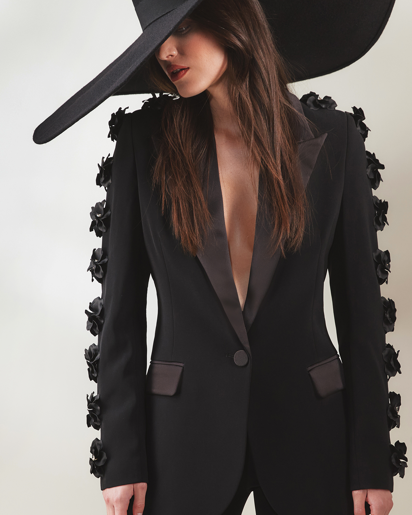 The Kira Black Blazer brings high-impact glamour with intricate crystal embellishments that shimmer in the light. Pair with the matching Kira Black Trousers for an unforgettable race day ensemble that’s equal parts bold and luxurious.