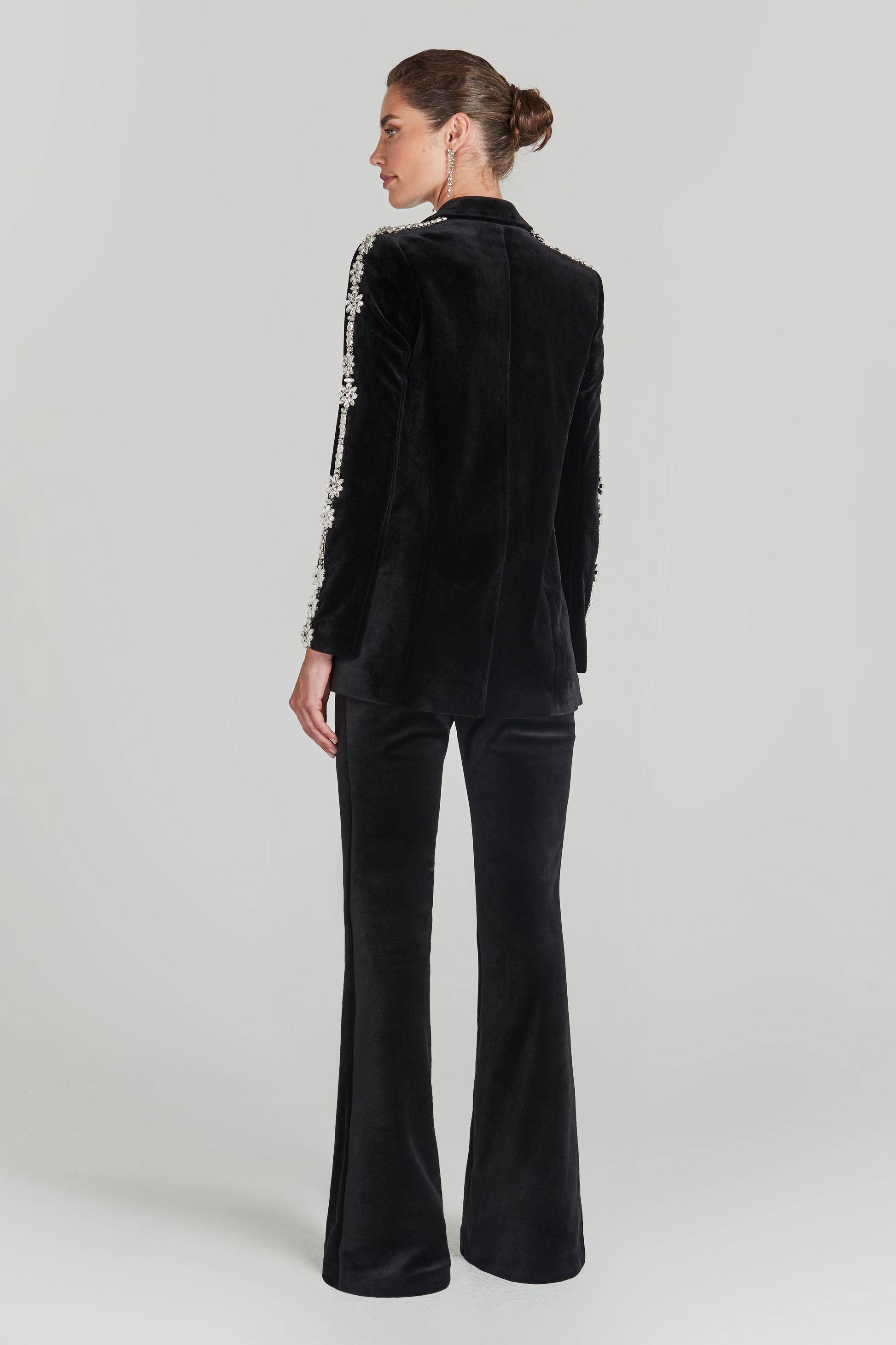 Elevate your collection with our iconic DAVINA. This sophisticated black velvet embellished blazer features a statement diamanté trim of crystal flowers for added decadence. Made from our exclusive velvet and fully lined with satin for a smooth and comfortable fit, this luxurious take on a women’s blazer is a must-have piece for this season and beyond. Matching black velvet trousers and black velvet embellished bra top are available.