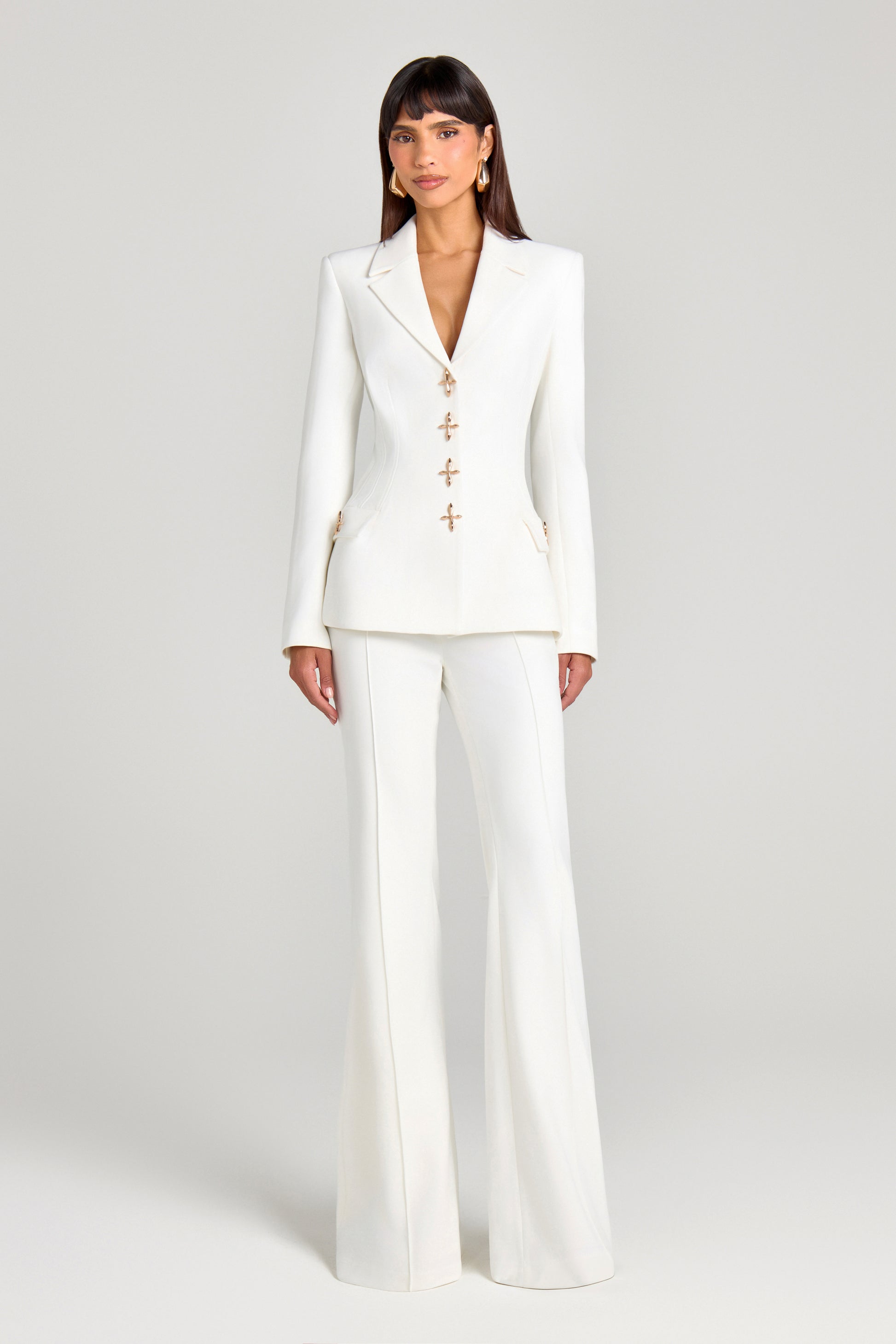 The CHARLOTTE WHITE TROUSERS are the perfect piece for those daring to make a statement. Made from our exclusive crepe and satin material, this simple statement trouser is perfect for those having rehearsal dinners or even for the big day.