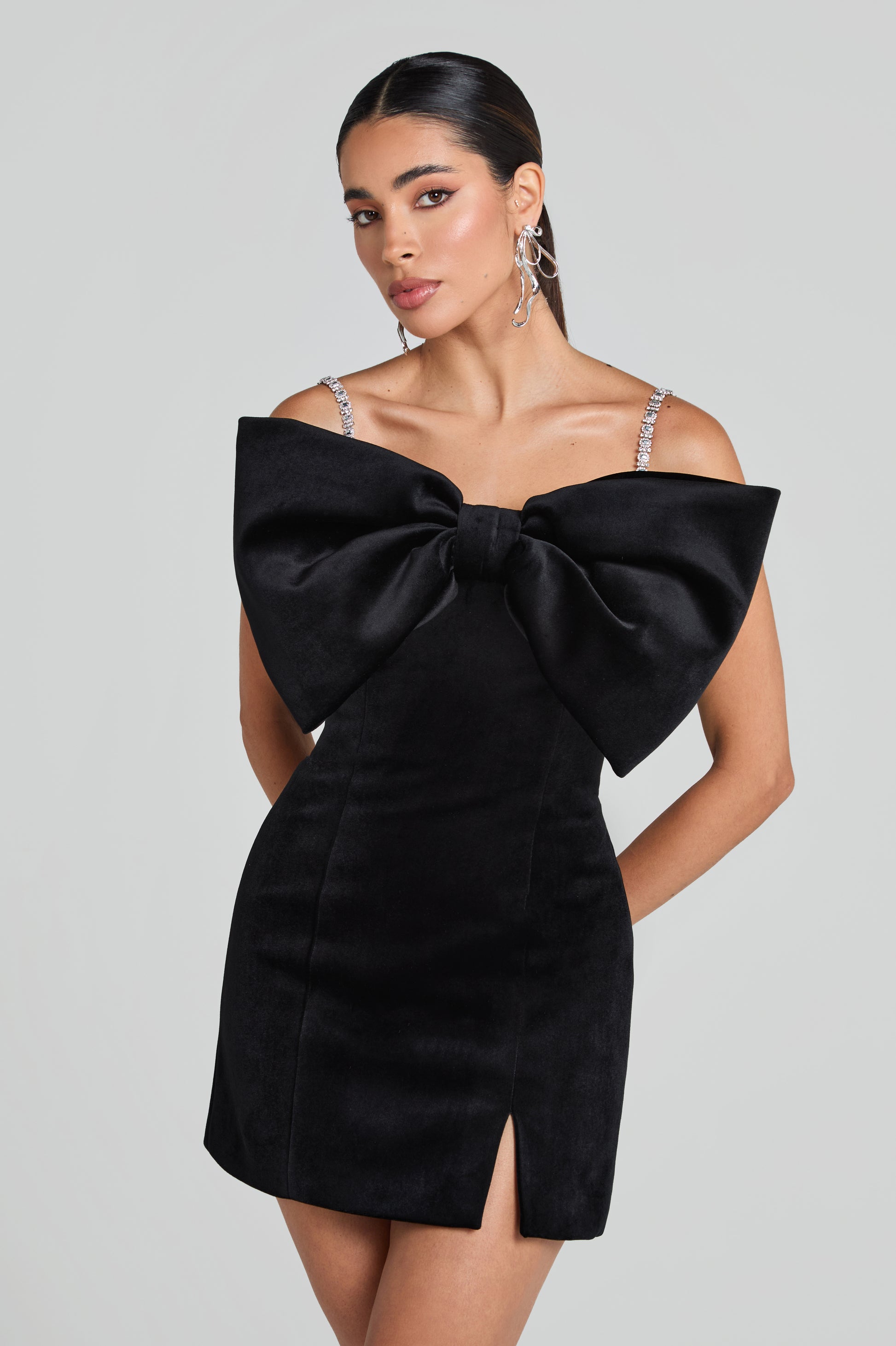 Our ELODIE Black Dress is crafted from black velvet fabric, featuring an exaggerated 3D bow, and jewel embellished detachable straps. This mini dress has internal boning to the front, back and sides, finished with a front split at the hem to contour your shape. Fully lined for a comfortable fit, the dress also includes internal silicone taping for extra support, and a concealed zip with hook-and-eye closure to the back.