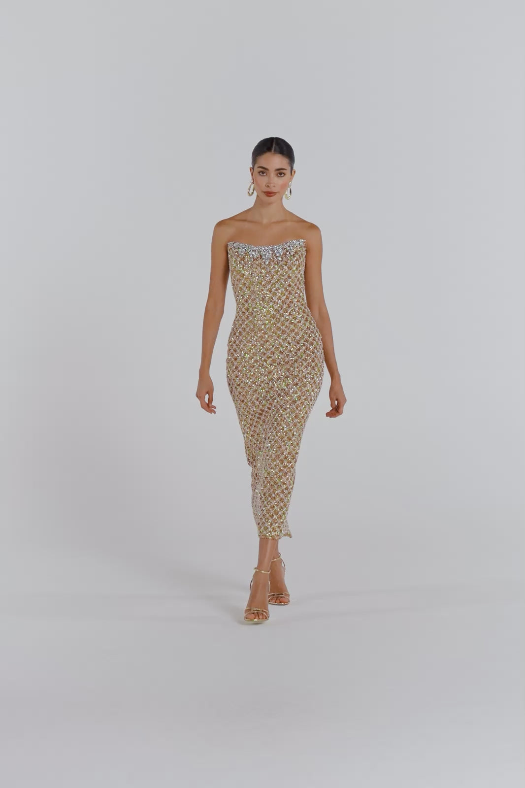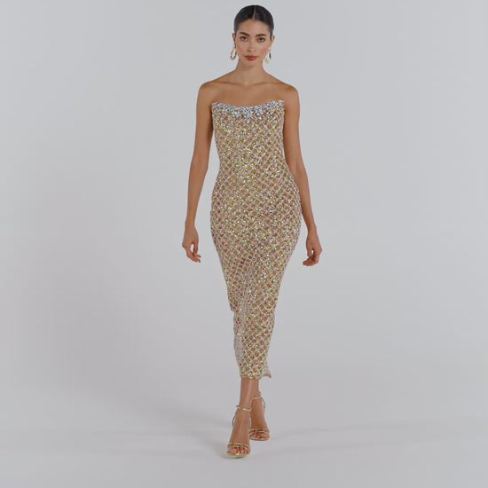 The ISABELLA Gold Dress is crafted from a luxurious gold sequin fabrication with a beaded embellished contrast silver overlay and features a structured bodice with boning at the front, back, and sides, paired with a straight-cut midaxi skirt. It is complete with a structured curved bandeau neckline with a silver-encrusted jewel trim and finished with a concealed zip closure at the back.