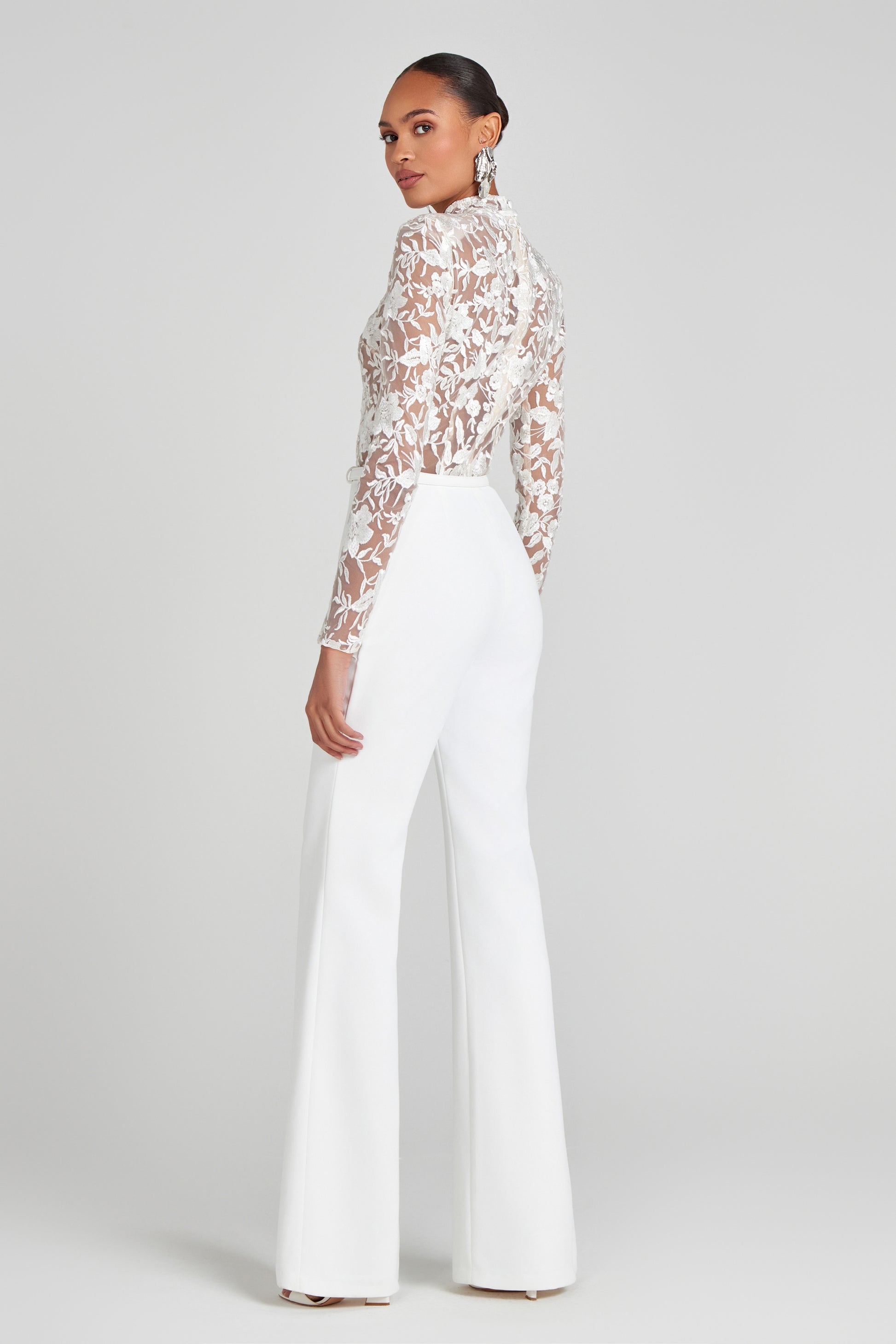 A fusion of celebration and sentiment in JOANNA. Where tradition is redefined. The round-neck embellished long-sleeve jumpsuit features sequin embellished floral lace embroidered onto a sheer-mesh base that showcases a hint of skin, creating an elegant floral arrangement cascading down the bodice. Featuring fully lined crepe trousers for a smooth fit and finished with a detachable crepe belt and an invisible zipper for a sleek finish.