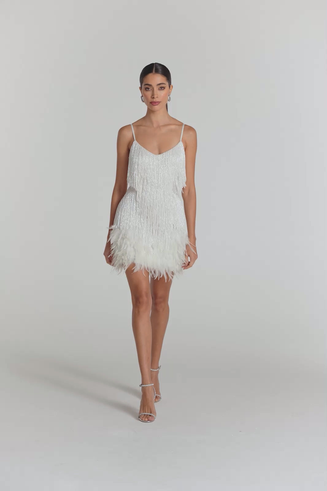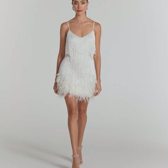 - White beaded fringing and sequins with flat beaded panelling on the waist to accentuate your curves and flatter your figure.