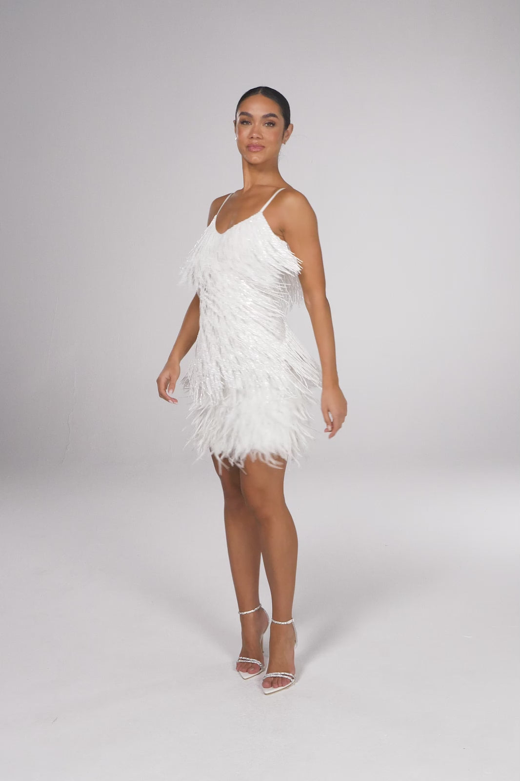 - White beaded fringing and sequins with flat beaded panelling on the waist to accentuate your curves and flatter your figure.