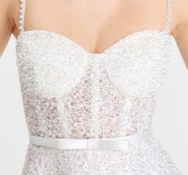 The MARYLIN White Dress is crafted from sheer white embellished beaded fabric, designed with a boned bodice for a cinched silhouette. Featuring satin underwired cups for enhanced support and comfort, and a midi-length skirt that flows with structure. Fully lined in mesh, the design is finished with a detachable satin bow belt and a choice of two detachable straps in satin or pearl-embellished for versatile elegance. A concealed zip closure at the centre back ensures a smooth, seamless fit.