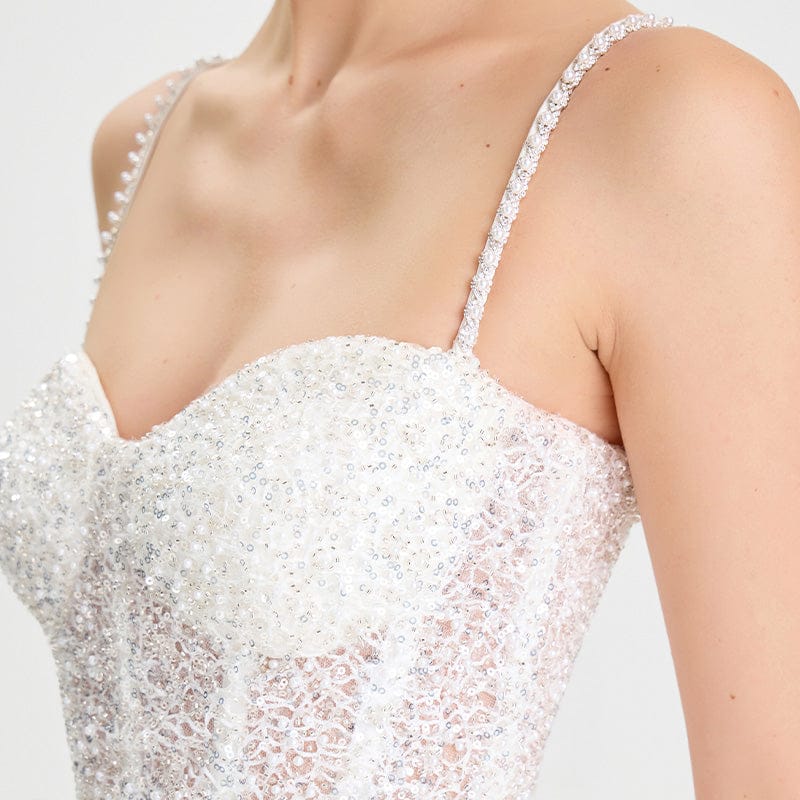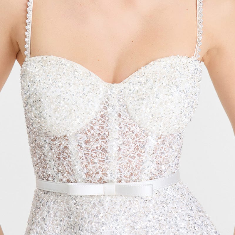The MARILYN White Dress is crafted from sheer white embellished beaded fabric, designed with a boned bodice for a cinched silhouette. Featuring satin underwired cups for enhanced support and comfort, and a midi-length skirt that flows with structure. Fully lined in mesh, the design is finished with a detachable satin bow belt and a choice of two detachable straps in satin or pearl-embellished for versatile elegance. A concealed zip closure at the centre back ensures a smooth, seamless fit.