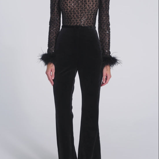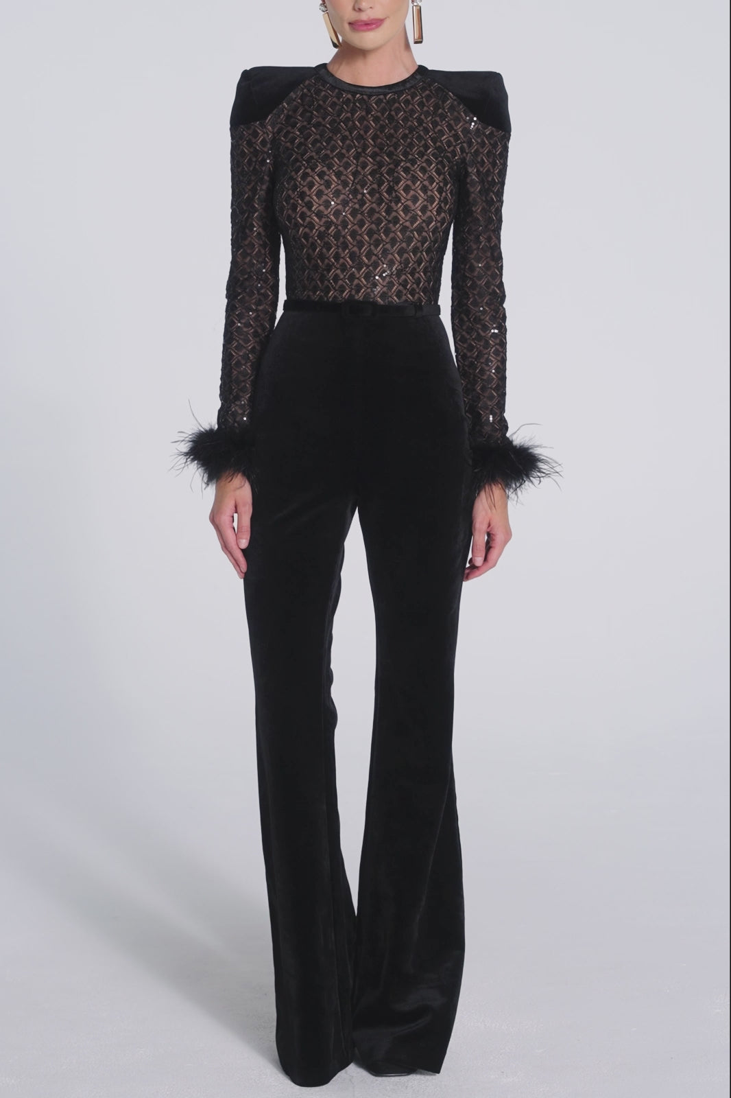 Meet Monique, our long-sleeve black velvet jumpsuit, and your next forever piece. This blend of delicate lace and plush velvet is designed to make you feel as alluring as you look. The jumpsuit has a nude lining, which provides coverage while accentuating the intricate lace detailing. The feather trim at the cuffs and contrast black belt add dramatic flair to this chic piece. This style looks equally as good paired with or without the belt.