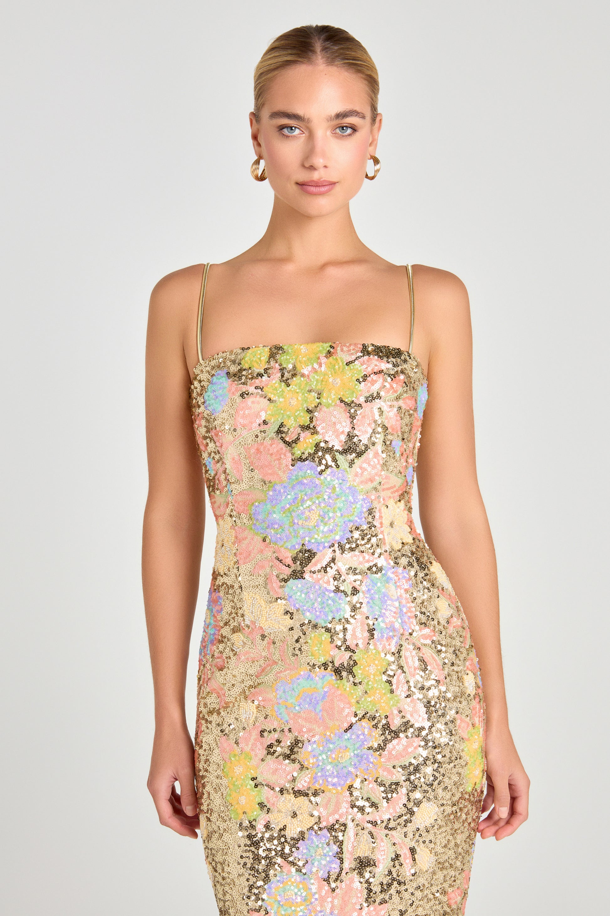 Wear the bouquet in the PALOMA Floral Dress. Designed with a bandeau neckline and a bodycon midi silhouette, this piece is crafted from a minimal stretch embellished sequin fabrication, made to mesmerise. Vibrant floral sequin and beaded detailing adds decadence throughout, while detachable liquid gold chain straps offer a touch of versatility. Internal boning at the front, back, and sides creates a sculpted, cinched-in silhouette. Finished with a concealed zip closure at the back for a smooth, seamless fit.