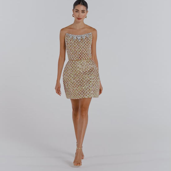 The SAVANNAH Gold Dress is crafted from luxurious gold sequin fabrication with a beaded embellished contrast silver overlay and features a structured bodice with boning at the front, back, and sides, paired with a signature tulip mini skirt. It is complete with a structured curved bandeau neckline with silver-encrusted droplet jewel trim and finished with a concealed zip closure at the back.